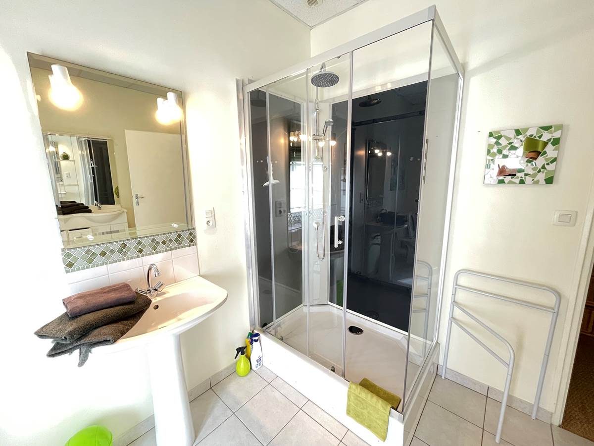 - 1 grande salle d'eau avec WC, 3 vasques, 1 sèche-cheveux et 1 cabine de douche,
